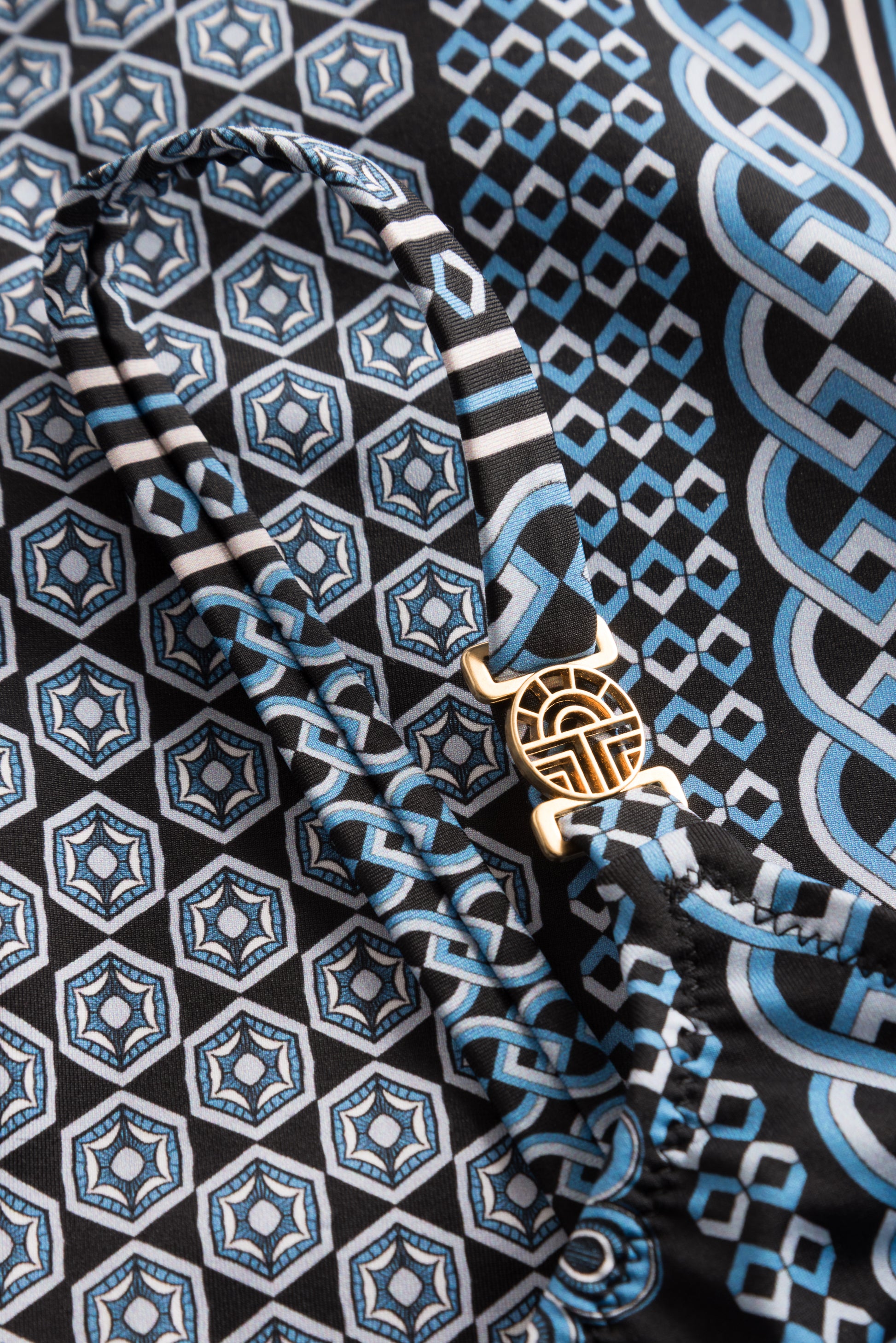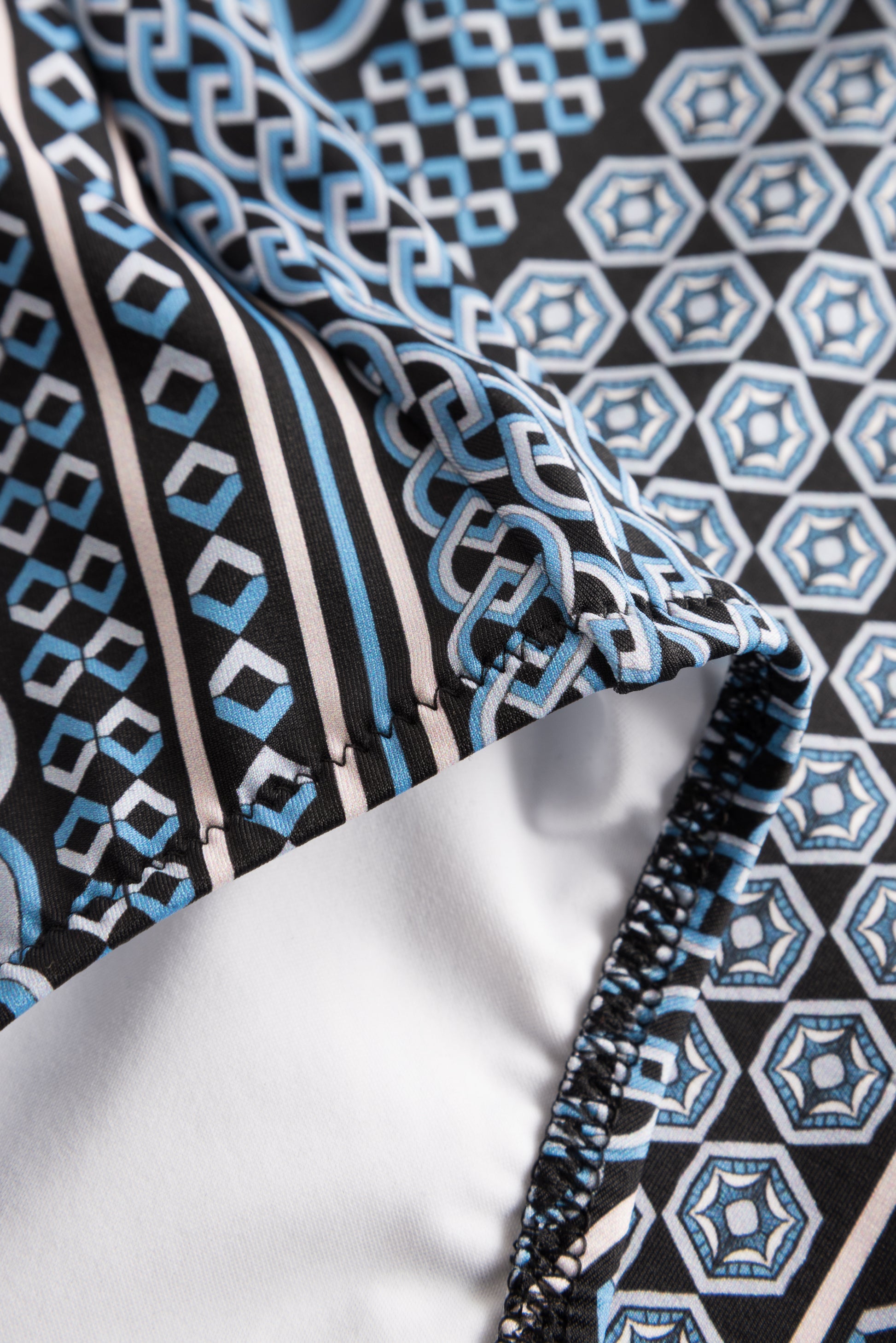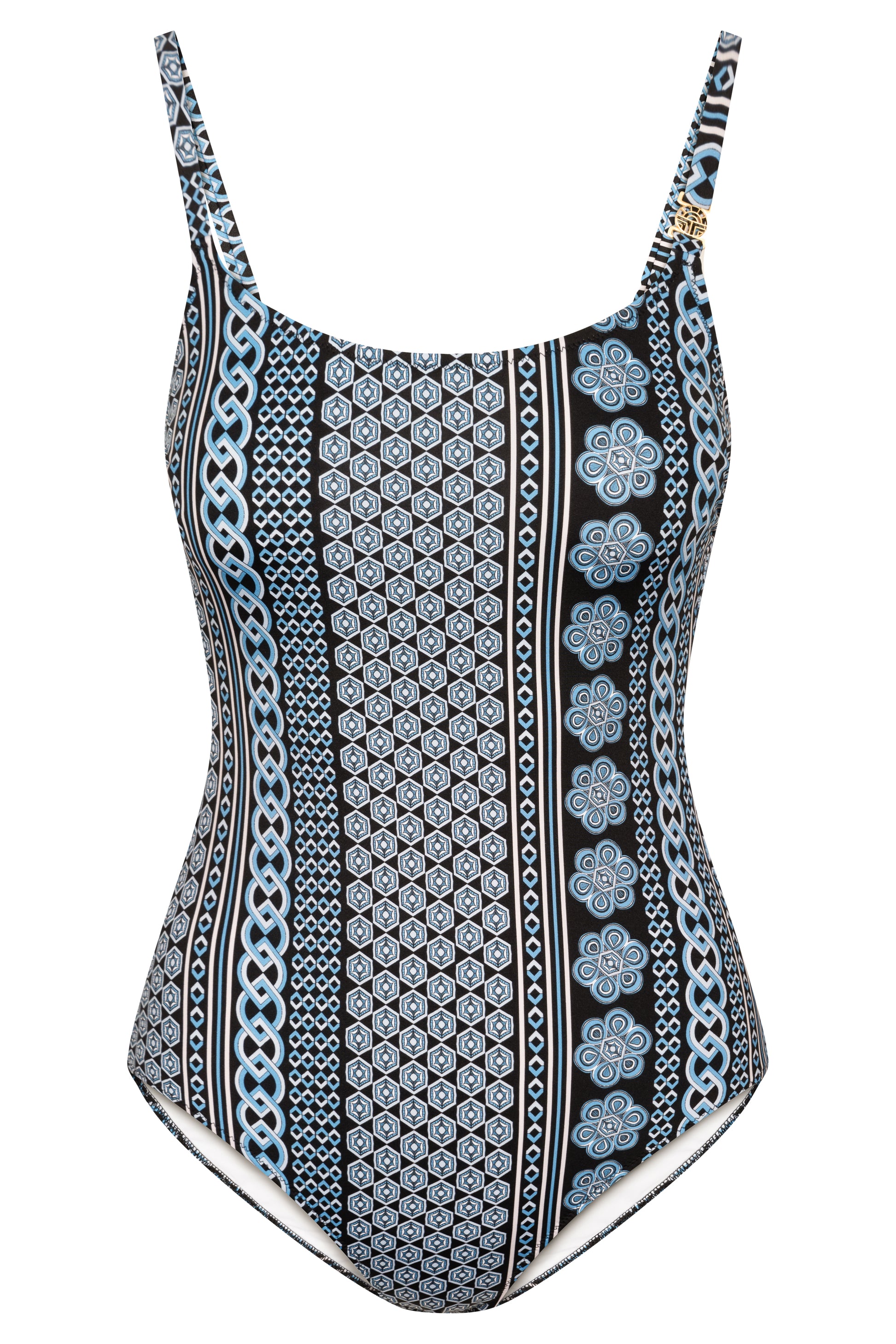 Der blaue Ketten-Design Swimmer ist mit Spacer-Cups, einem Unterbrustgummi und verstellbaren Trägern gefertigt sowie einem schönen Beinausschnitt gestaltet.