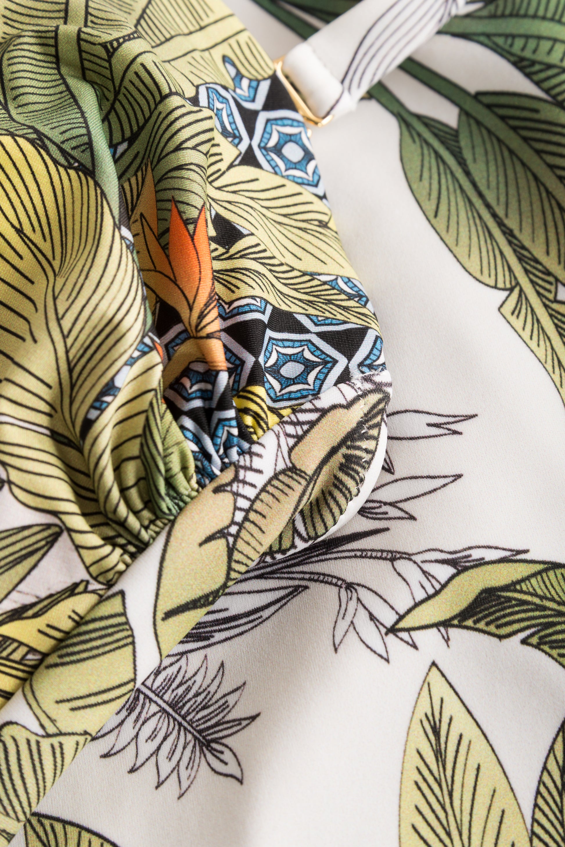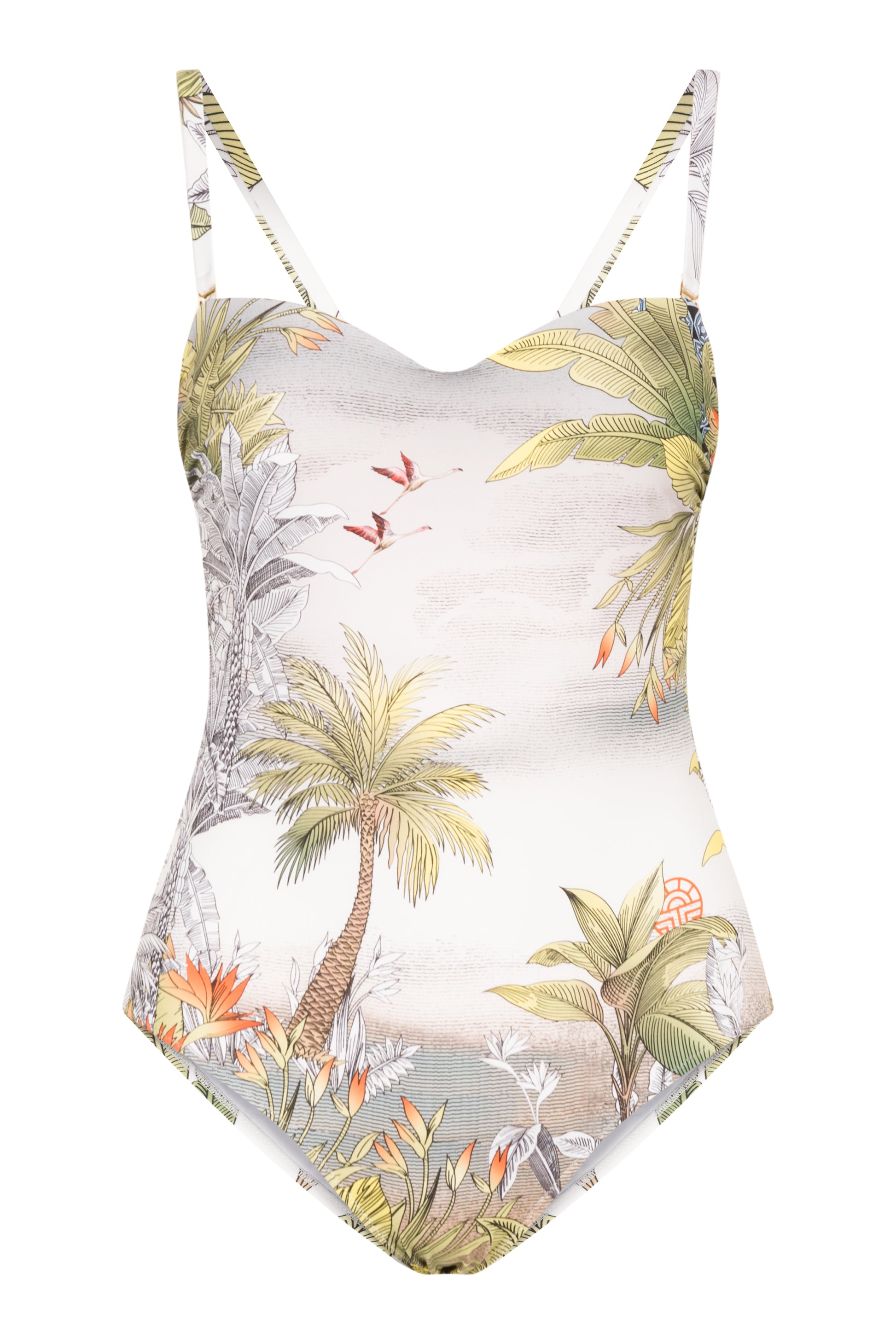 Das Jungle Design mit exotischen Palm-Print besticht durch seinen femininen Ausschnitt mit Spacer-Cups und Unterbrustgummi sowie den abnehmbaren und verstellbaren Trägern.