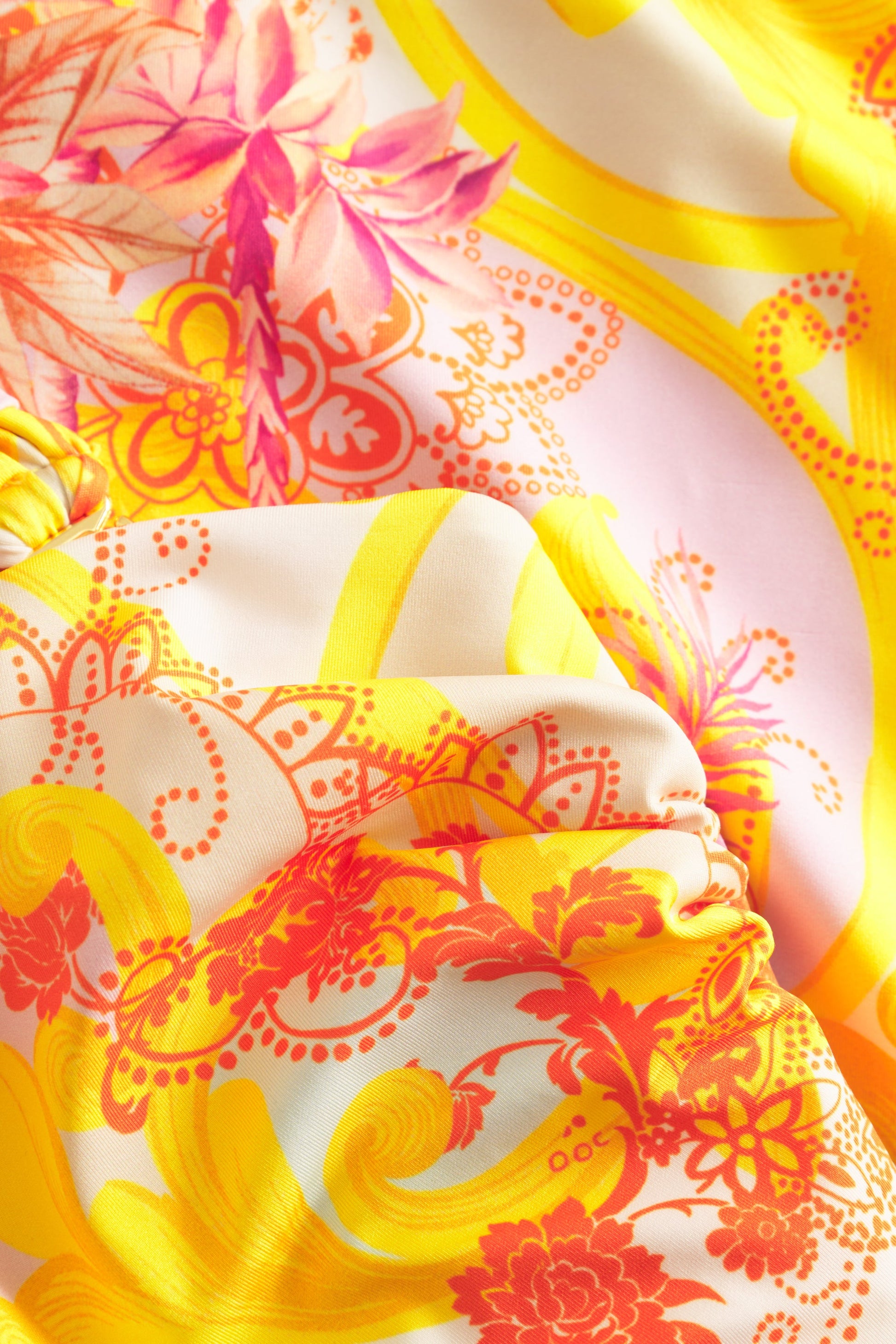 Dieser Bandeau-Badeanzug mit Spacer Cups im platzierten Ornamentdessins mit Palmen und Rosen bietet durch seinen breiten Träger zusätzlichen Tragekomfort, der aber bei Bedarf durch einen schmalen, klassischen ersetzt werden kann.