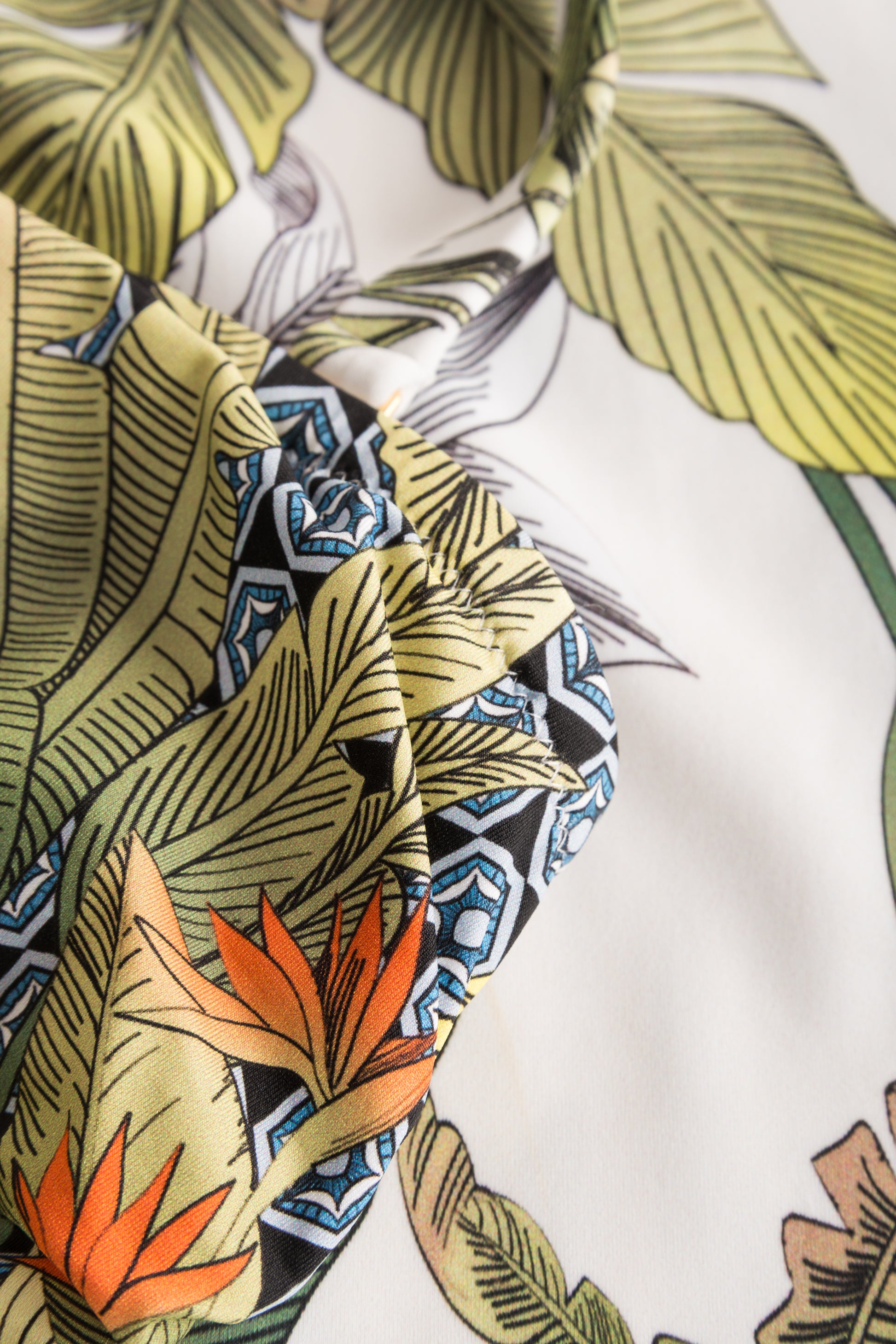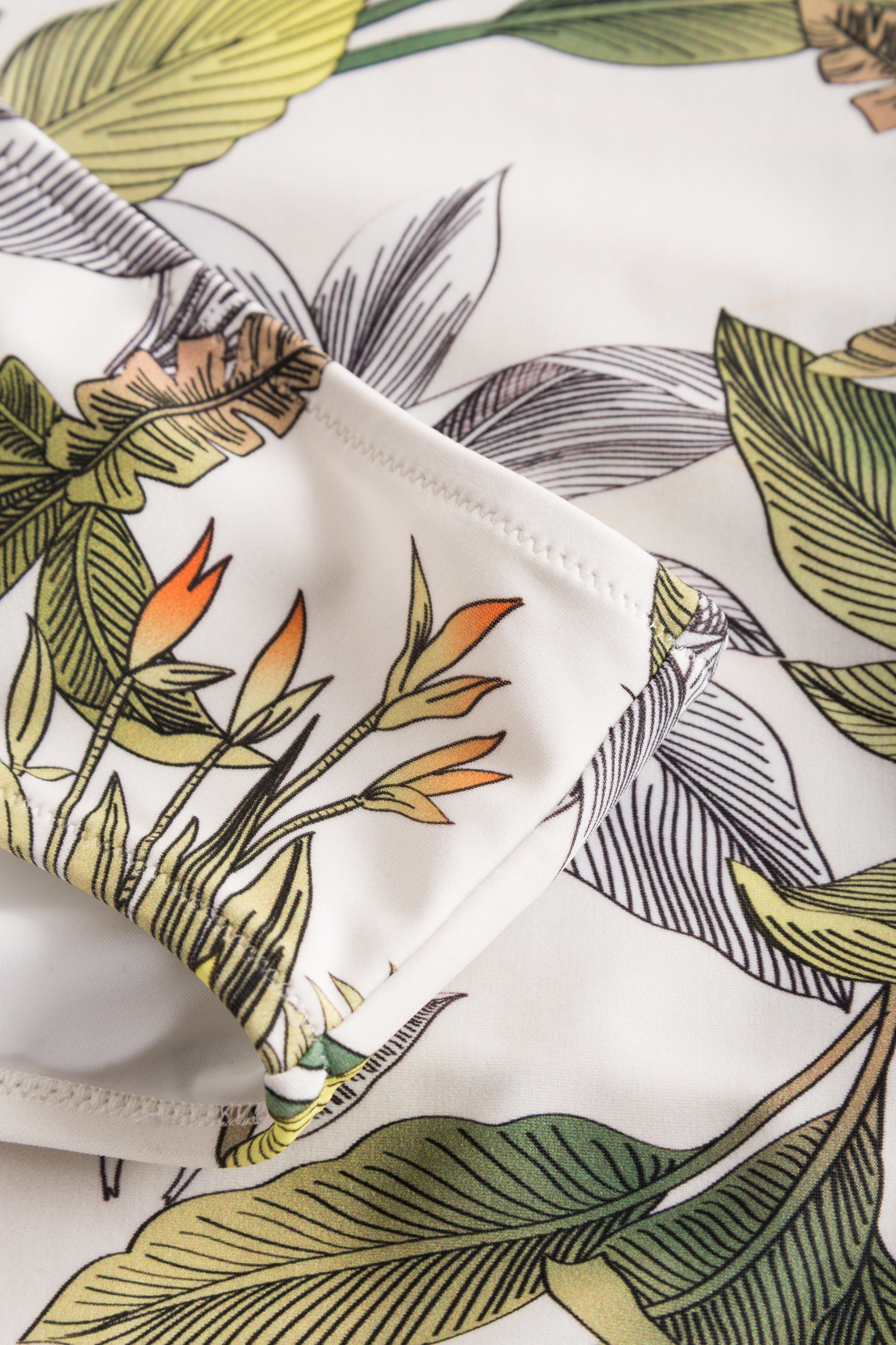 Das Jungle Design mit exotischen Palm-Print besticht durch seinen geraden Bandeau-Ausschnitt mit Bügeln und Unterbrustgummi sowie den abnehmbaren und verstellbaren Trägern.