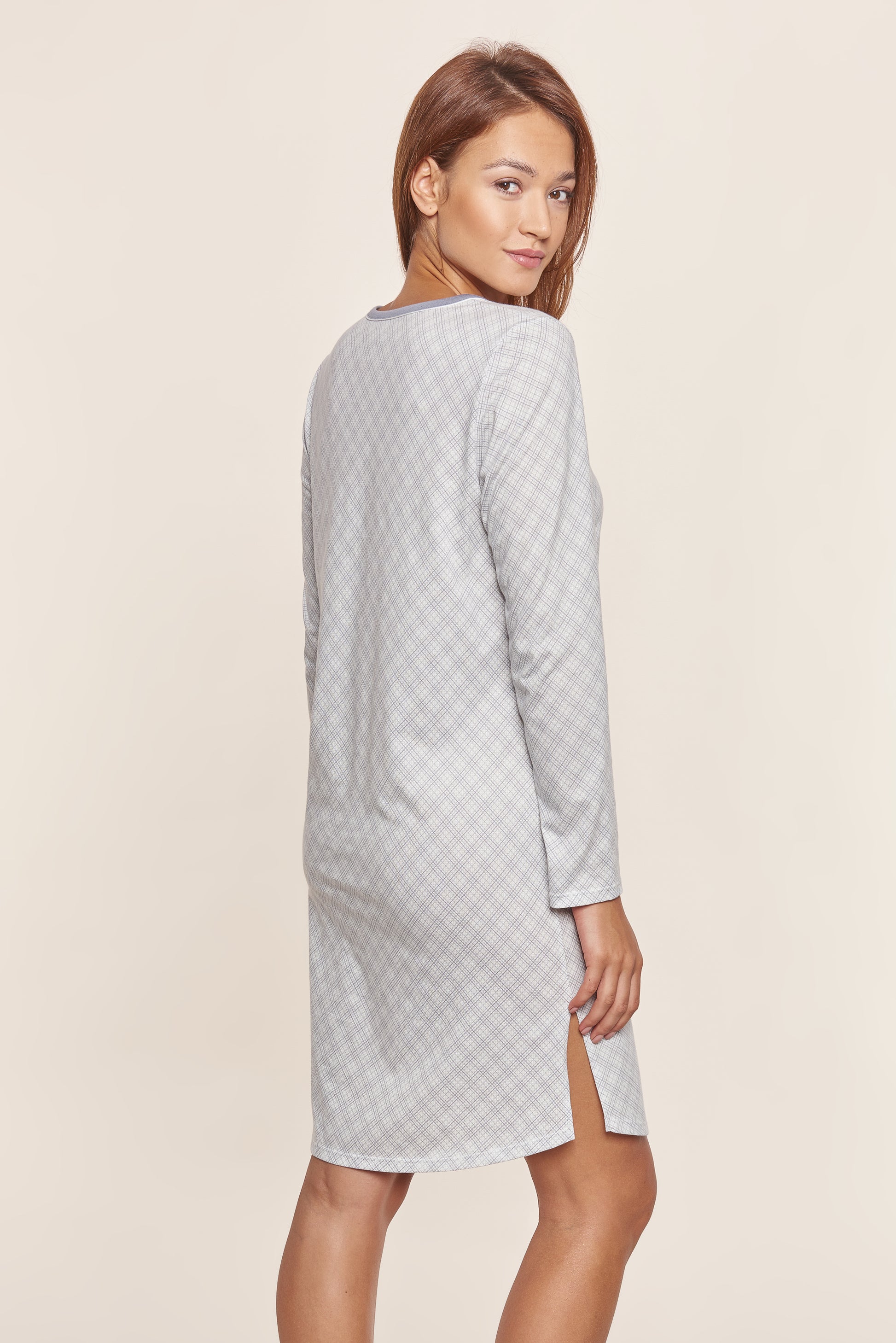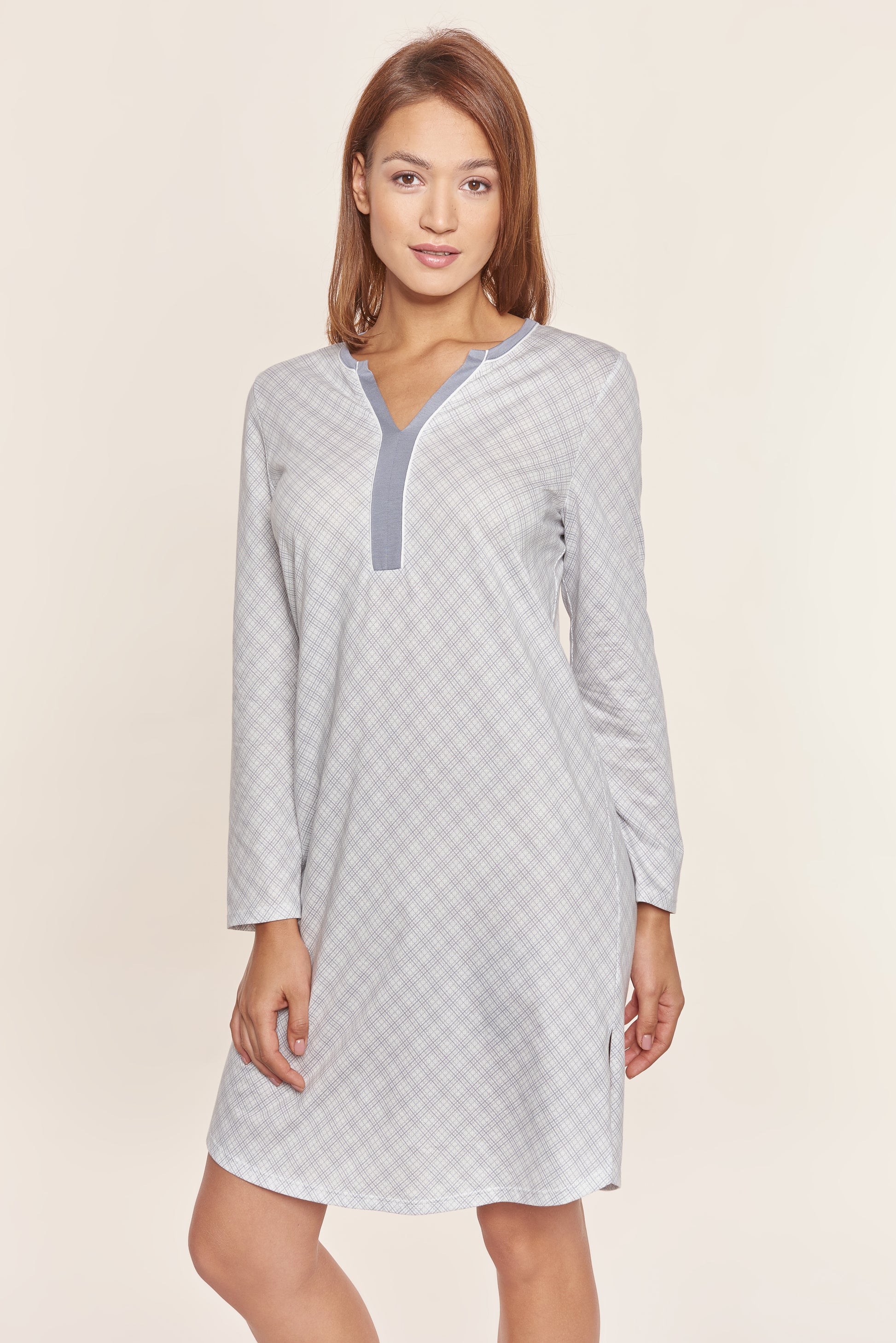 Das Bigshirt ist aus feinem Druck mit minimalistischem Diagonalkaro und Kombi aus Uni gearbeitet. Das Halsloch ist mit Frontblende in Uni und schmaler Kontrastpaspel gearbeitet. Seitliche Schlitze sorgen für Komfort.