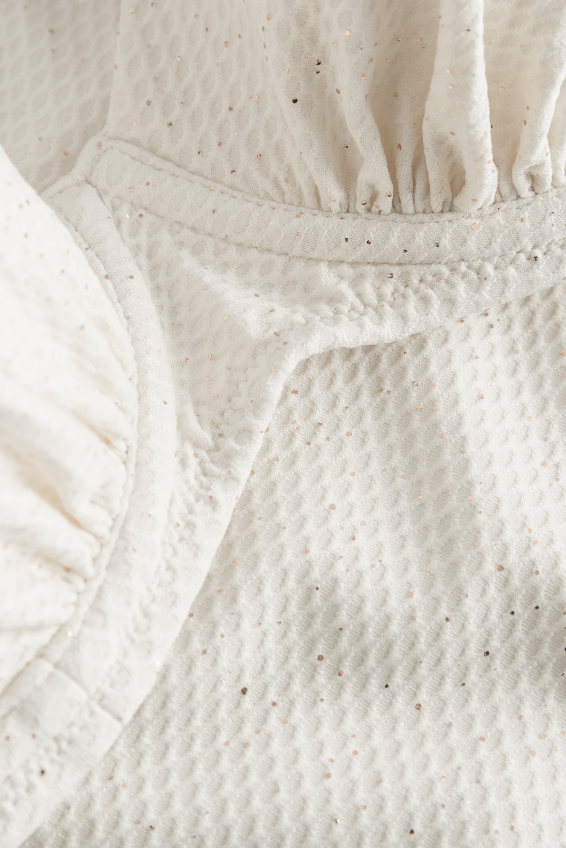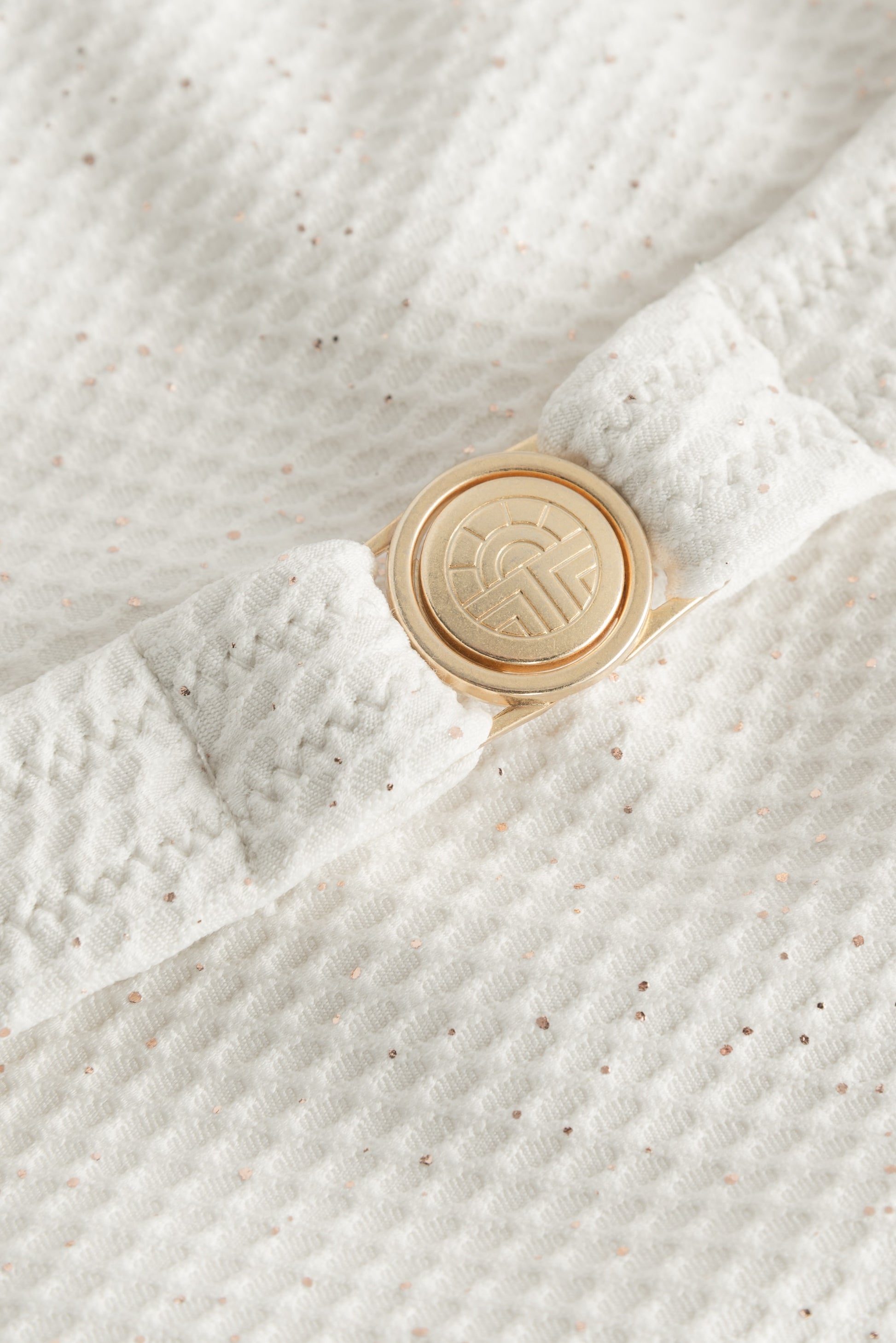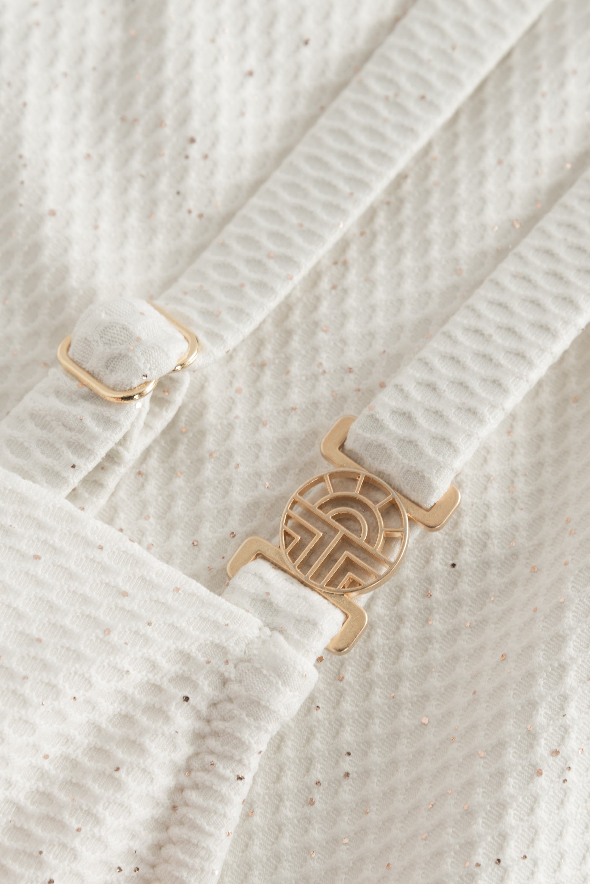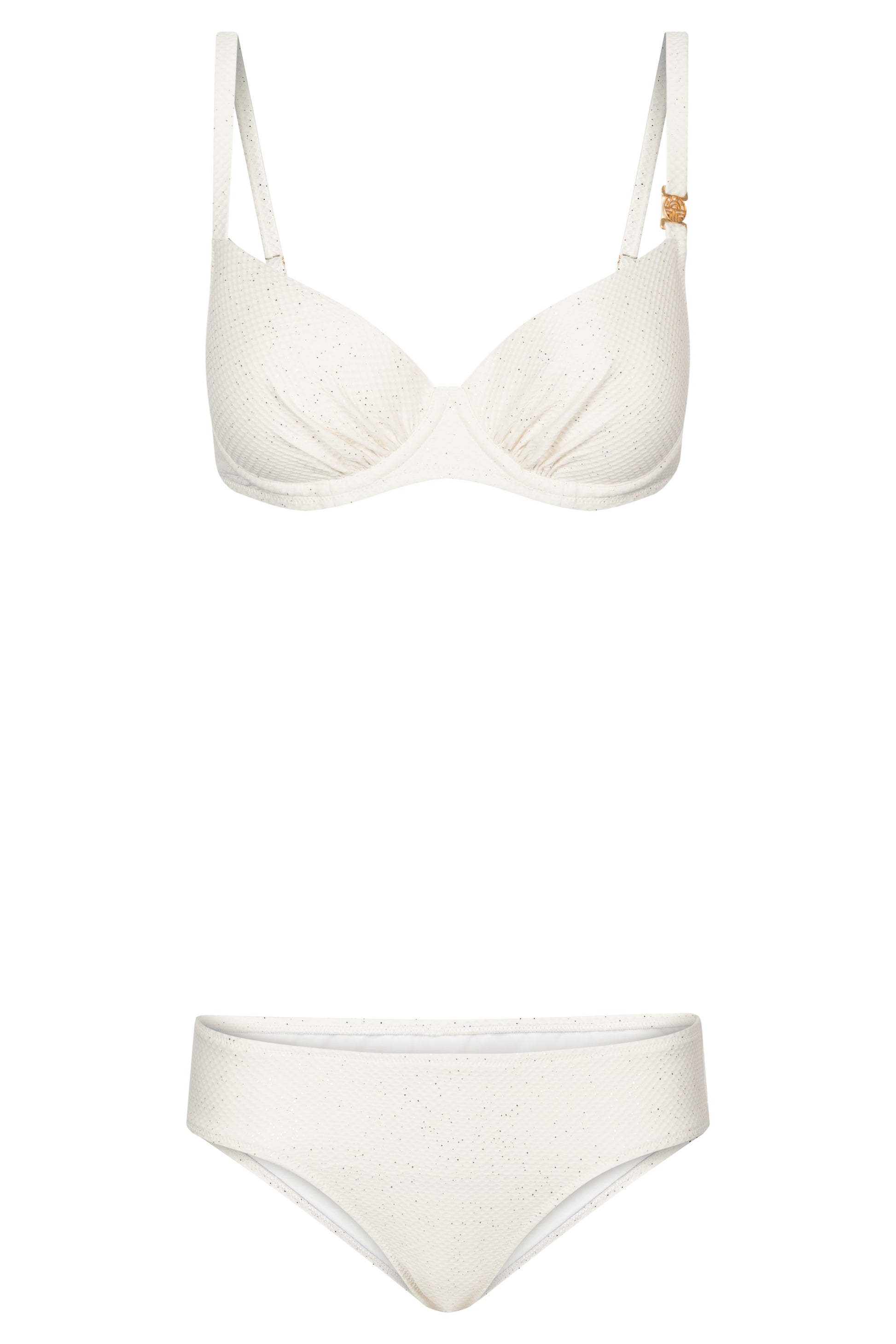 Ein besonders sinnlicher Bikini mit cremefarbener Struktur und Glitzer in Roségold. Das Design besitzt Spacer-Cups mit Bügeln sowie ein schönes modernes Beinausschnitt und Träger zum Verstellen.
