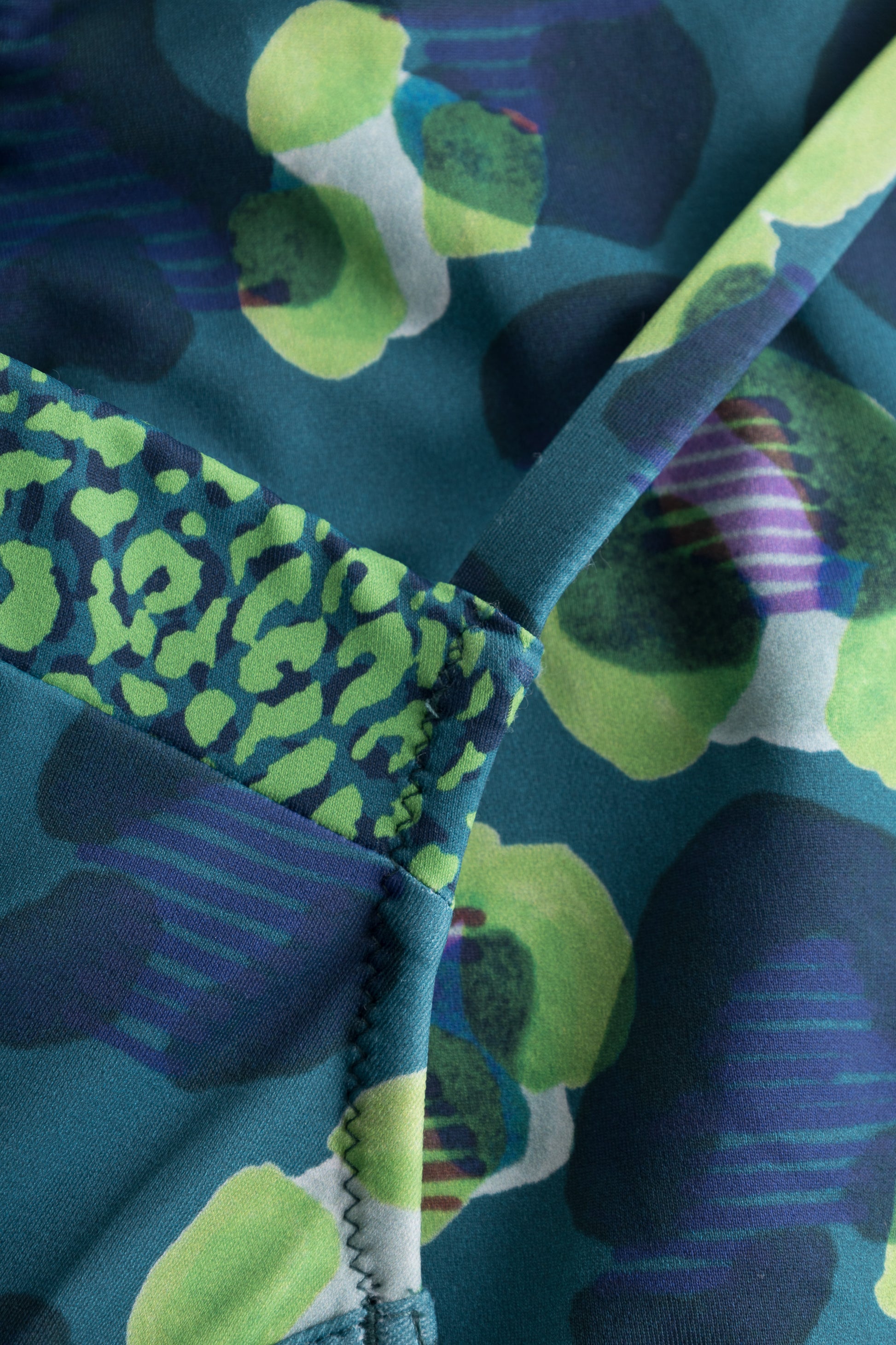 Ein besonders charmanter Bikini im modernen Leo-Mix Dessin. Die Grüntöne schmeicheln jedem Hautton. Das Design besitzt Spacer-Cups mit Bügeln sowie Träger zum verstellen.