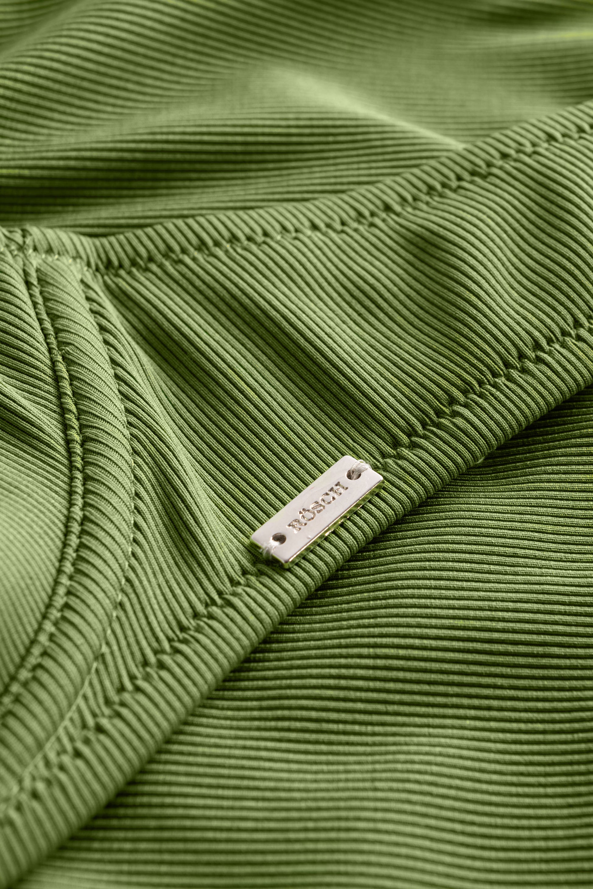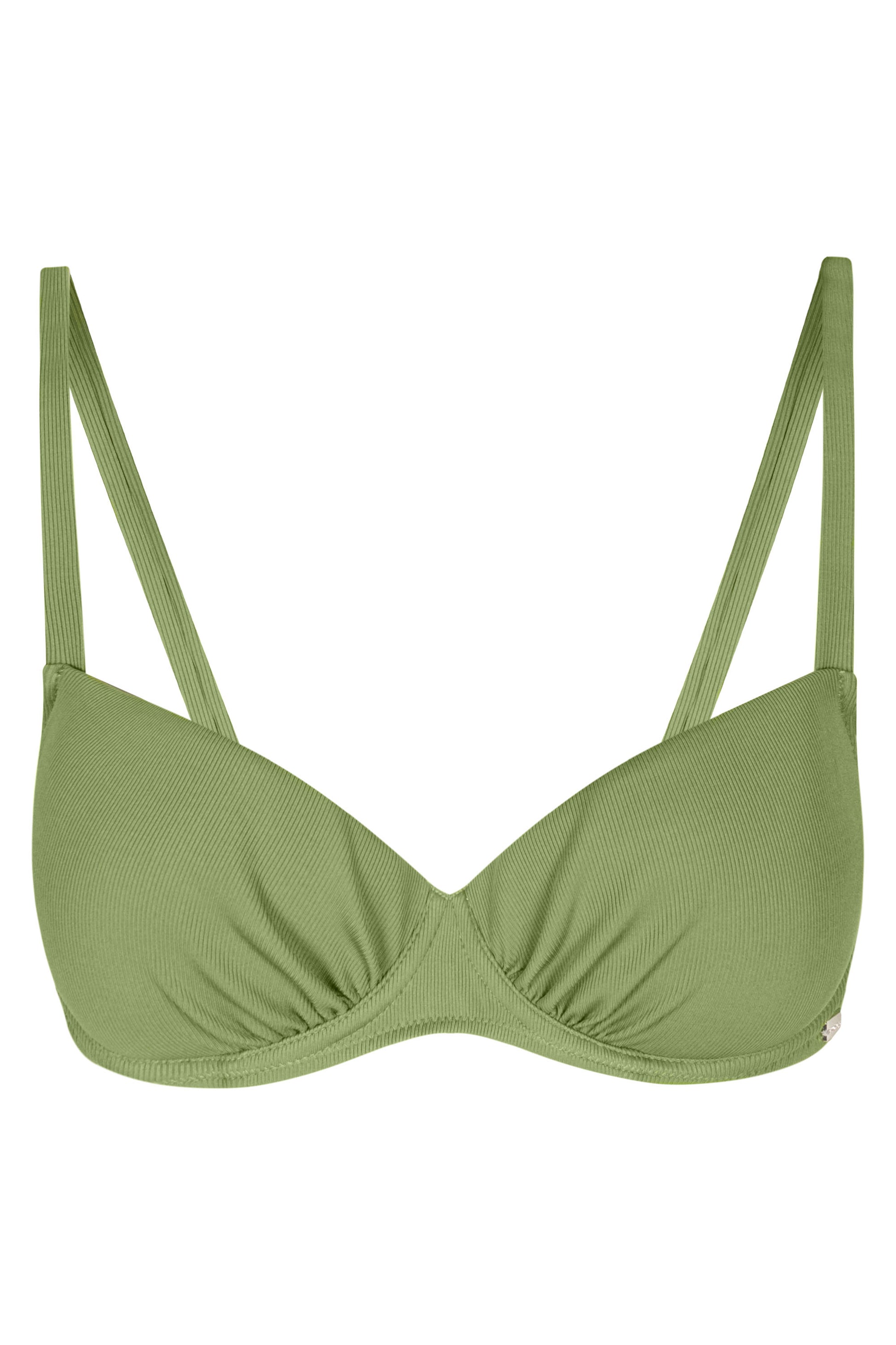 Ein besonders trendiges Bikini-Oberteil mit Ripp-Struktur in Grün. Das Modell besitzt Spacer-Cups mit Bügeln sowie Träger zum Verstellen.