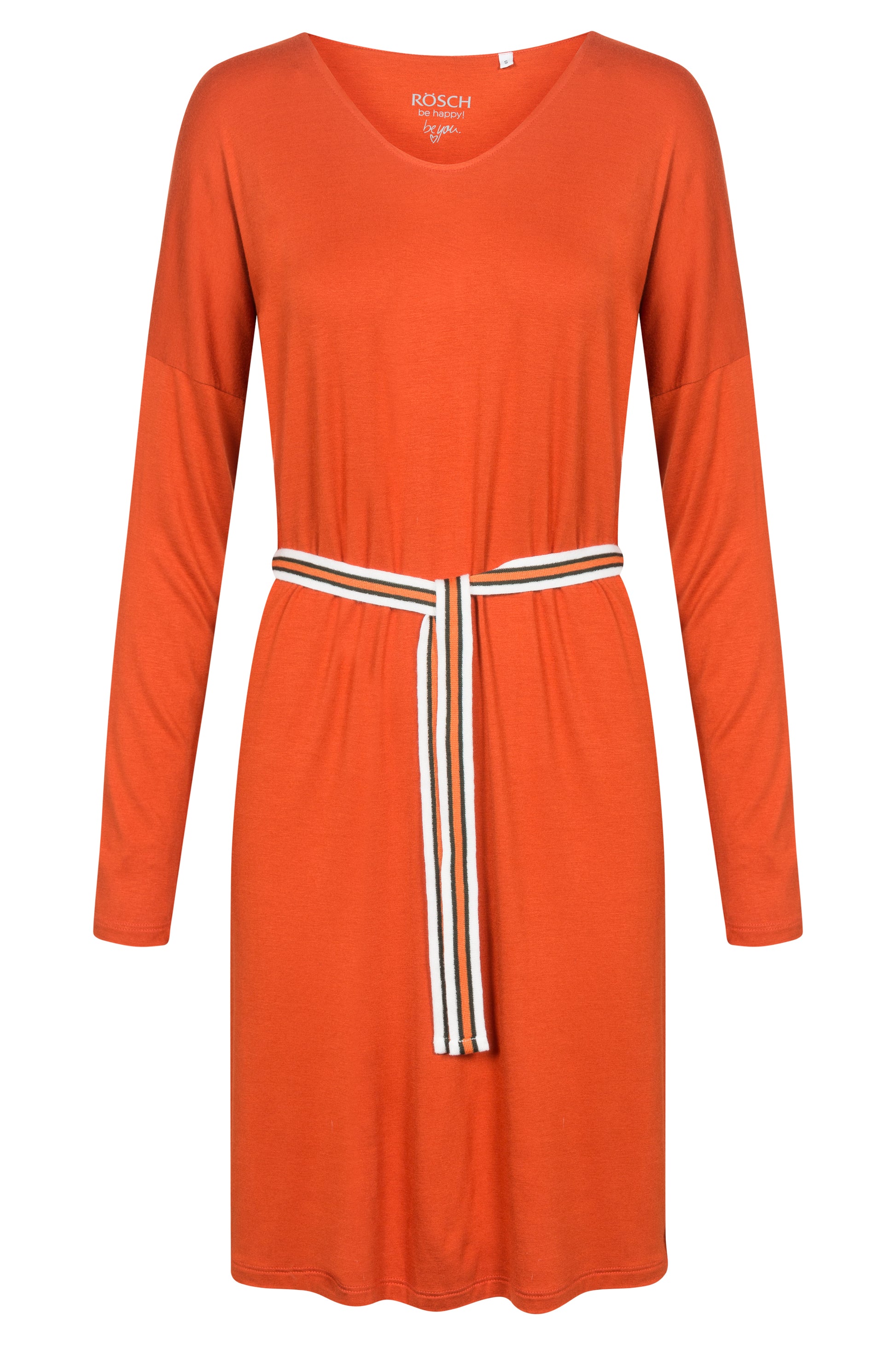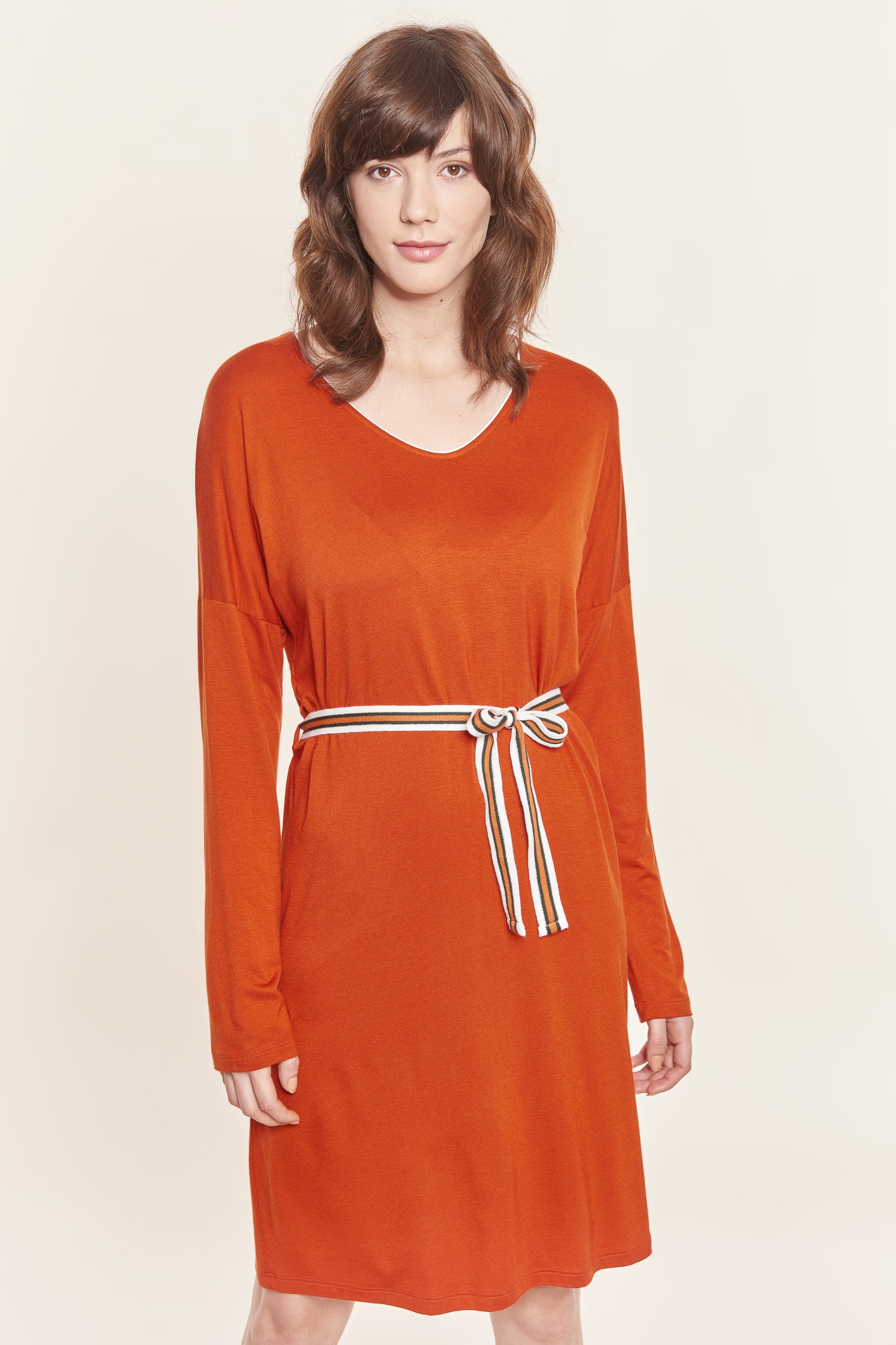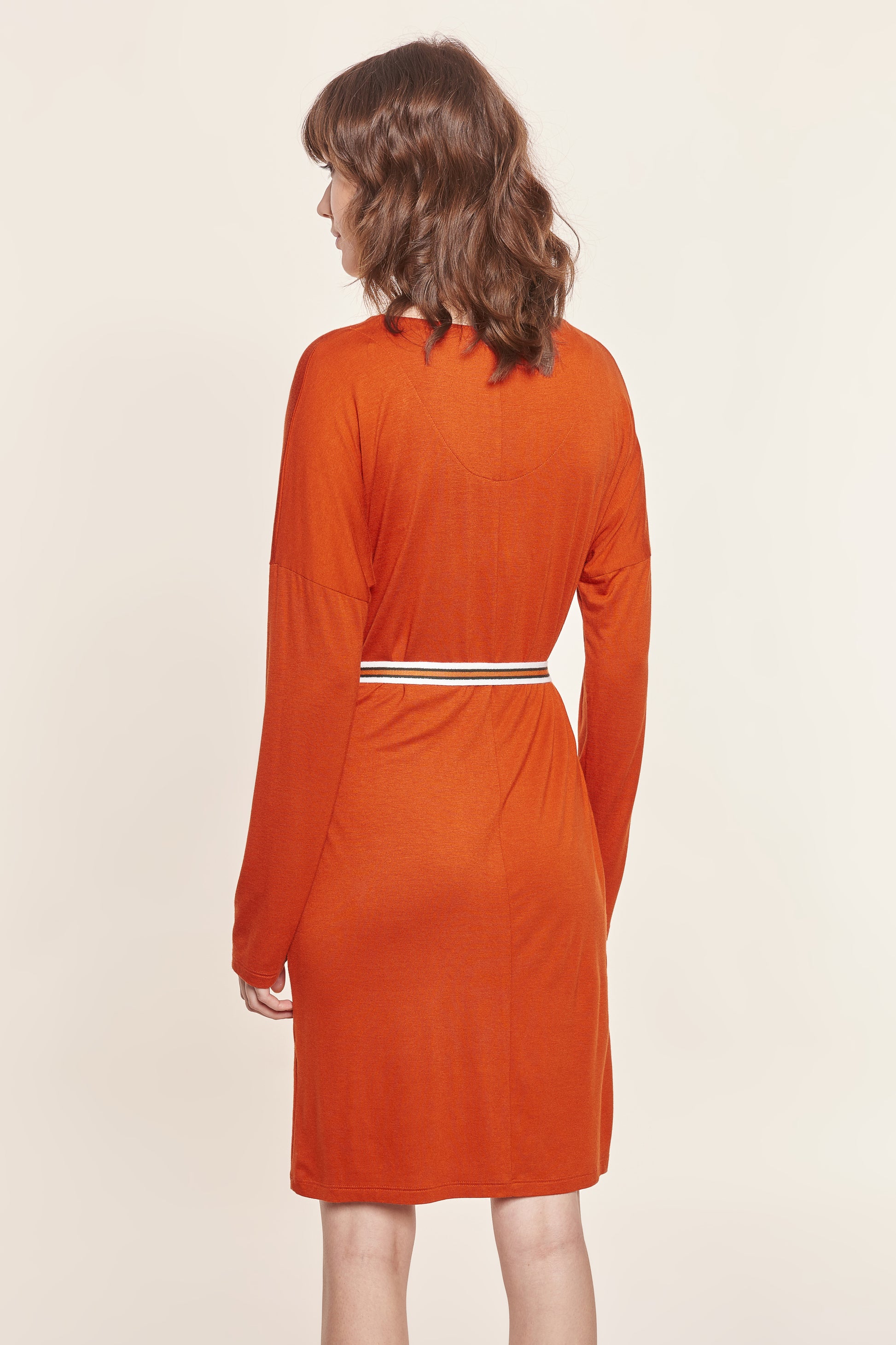 Longsleeve-Kleid mit überschnittener Schulter und V-Neck in Terrakotta. Passender Taillen-Gürtel zum Binden.