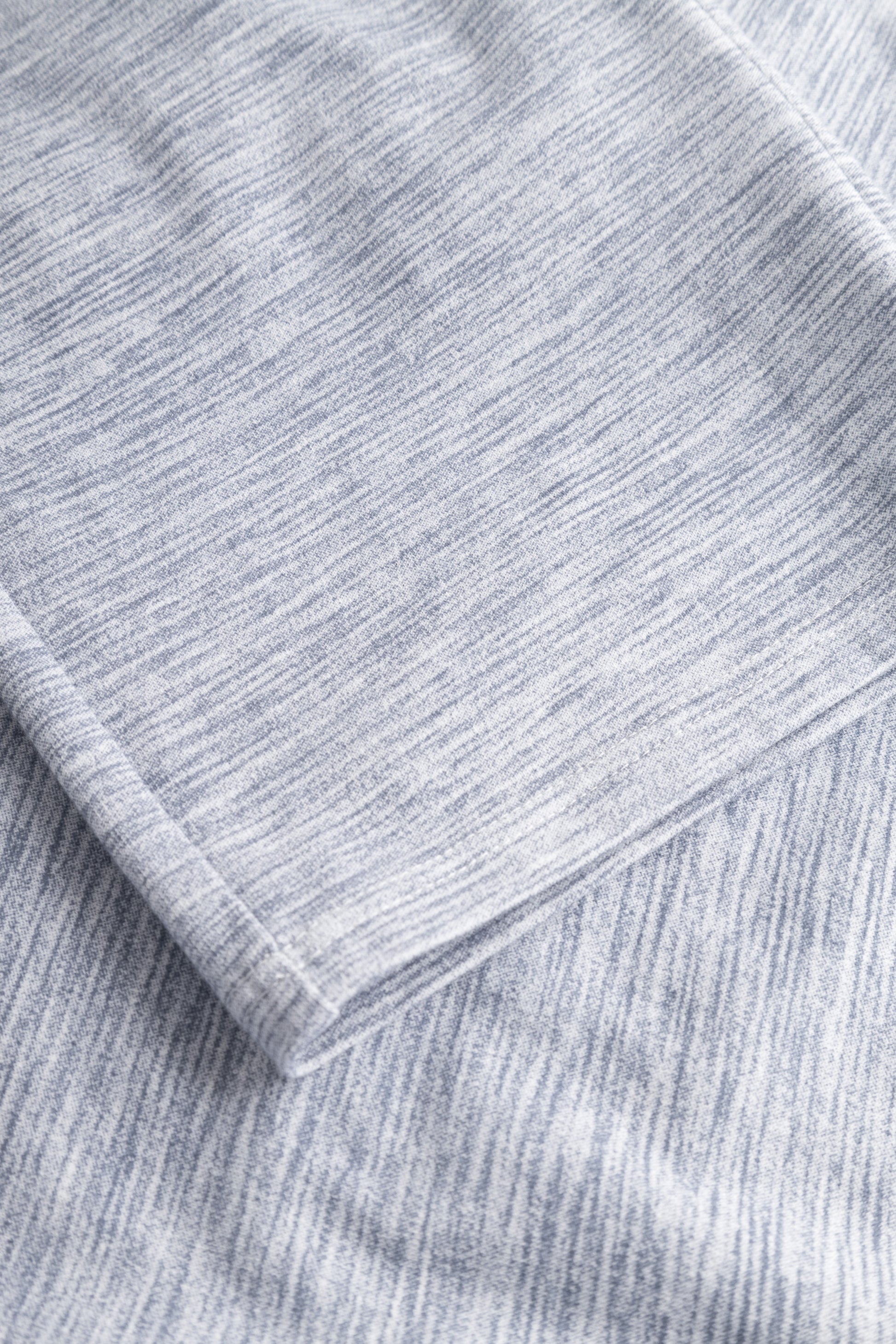 Das Design besteht aus Bio-Baumwolle mit Elasthan und ist in blauer Melange-Optik. Die Hose besitzt eine schmale Form sowie Taschen und eine Zier-Schleife.