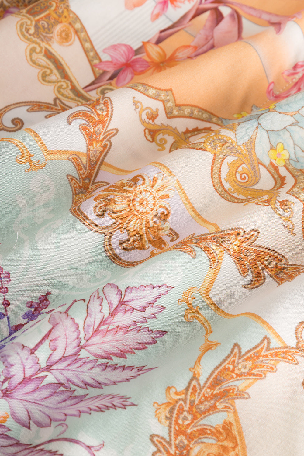 luftiger Kaftan aus einer kühlenden Viskose Voile Qualität. Das Modell im Ornament Blumen Dessin ist lässig geschnitten und hat einen Rundhalsausschnitt.