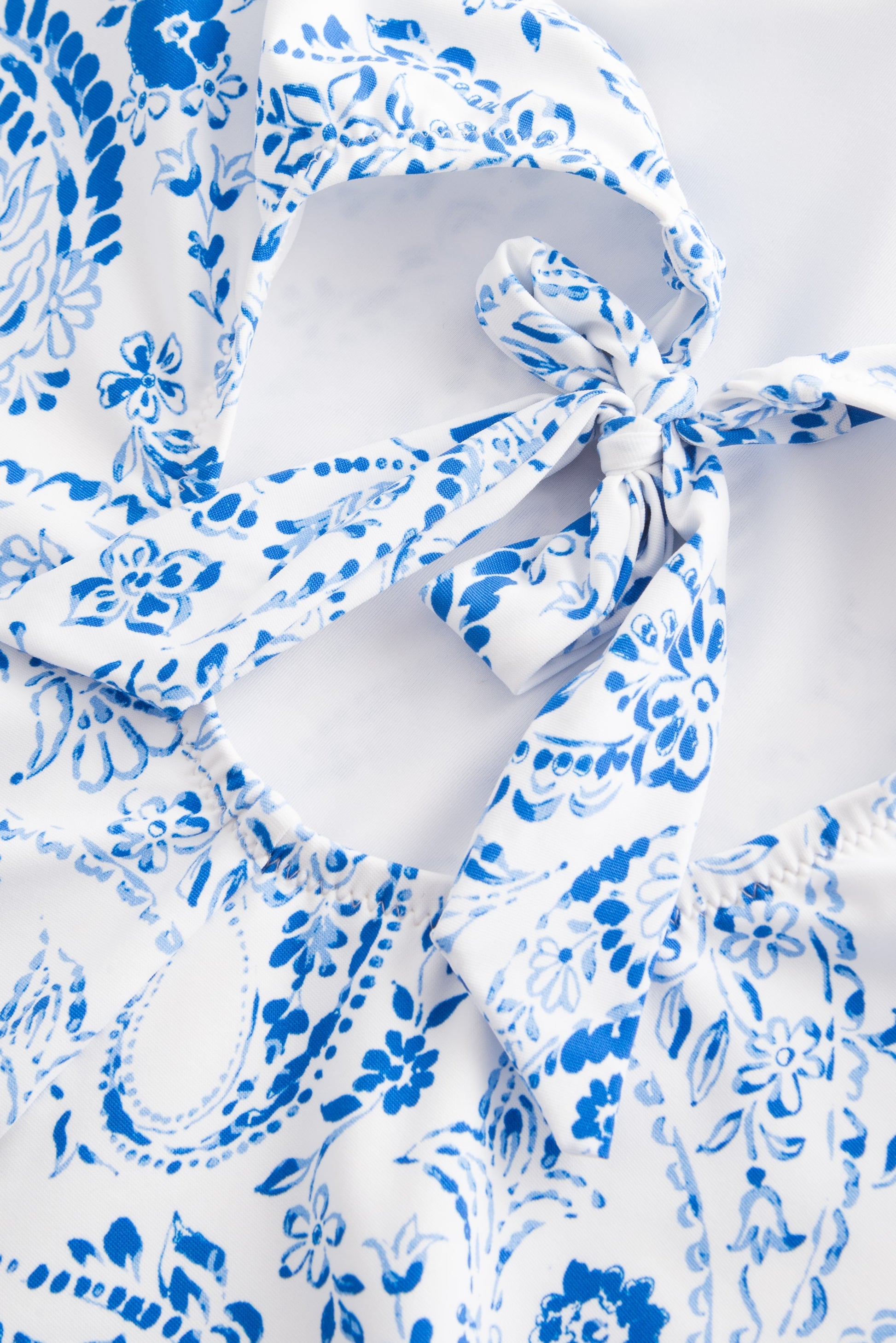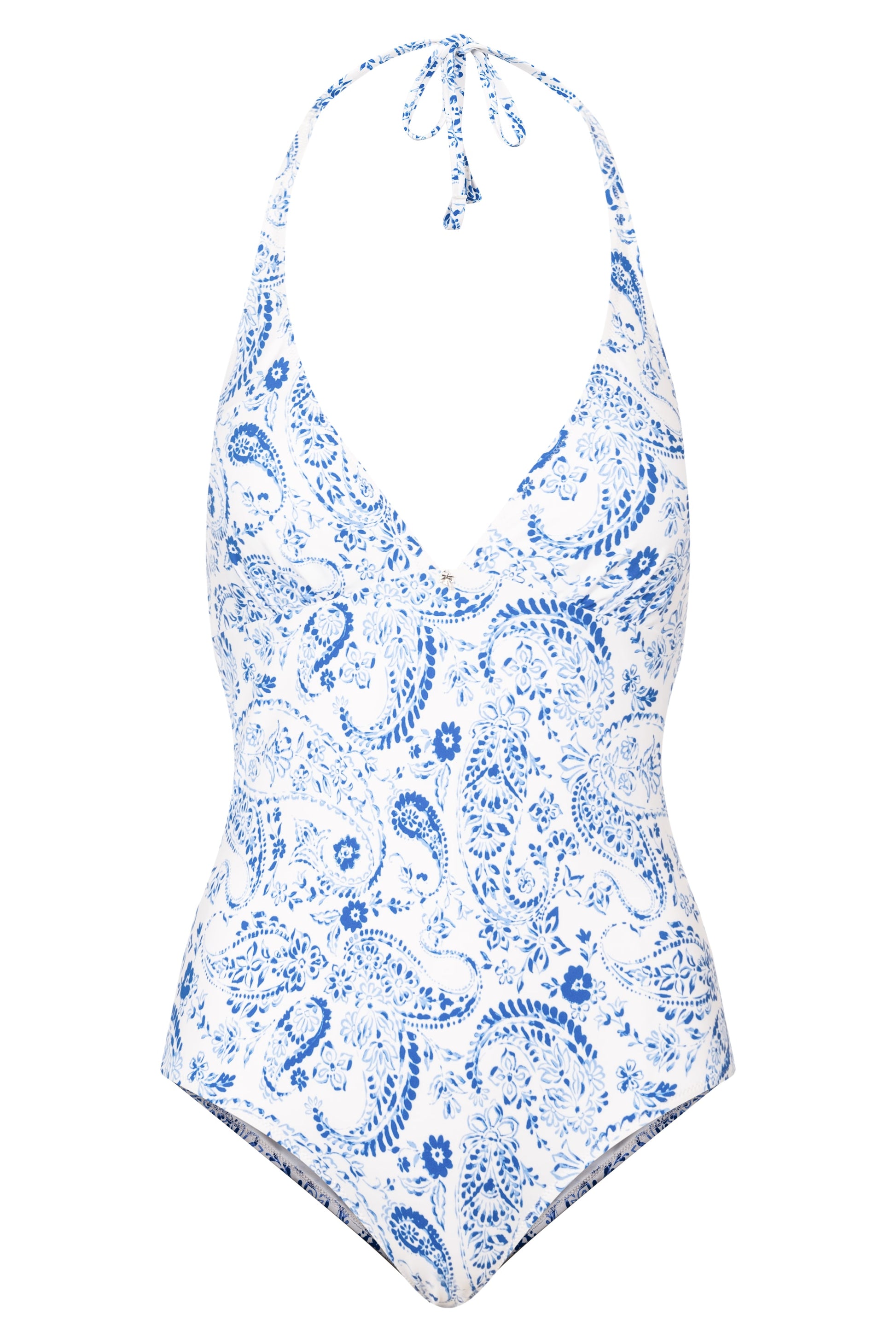 Ein charakteristisches Paisley-Muster definiert diesen Neckholder-Badeanzug. Das Modell besitzt Spacer-Cups. Zudem können die Träger auf verschiedene Möglichkeiten gebunden bzw. getragen werden.