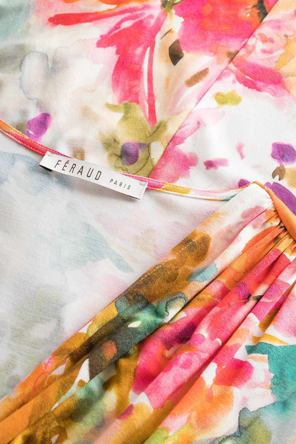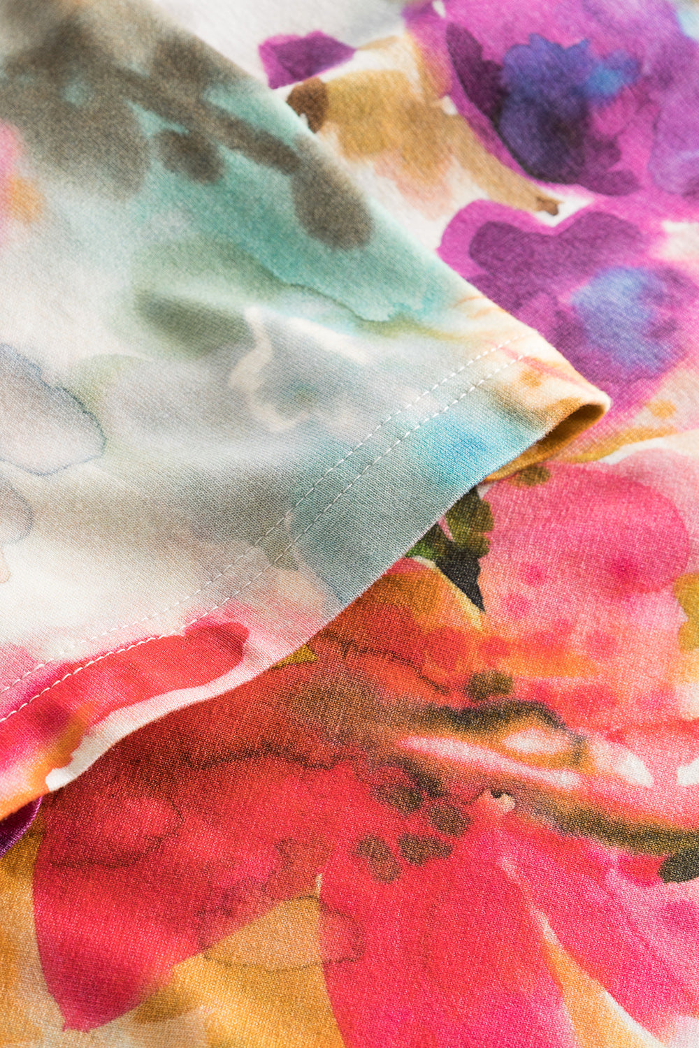 Das Cocktailkleid in Wickeloptik mit Halbarm und einem V-Ausschnitt. Das Kleid aus einer angenehmen Viskose-Elasthan Qualität ist in einem farbenfrohen Aquarell Print gefertigt.